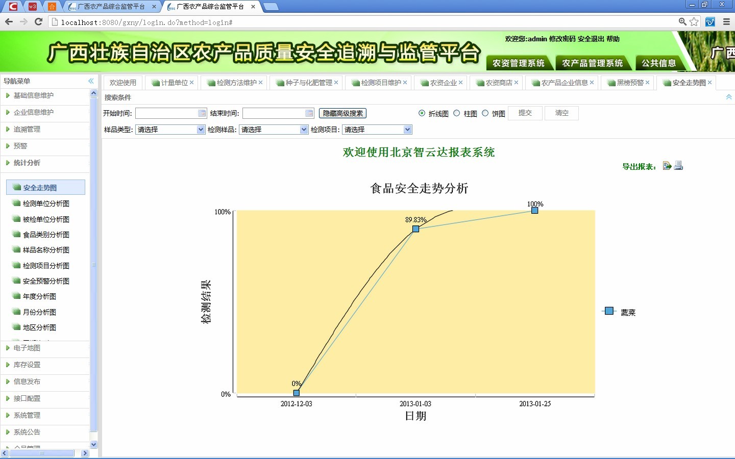 1.1檢測數(shù)據(jù)預(yù)警 、安全走勢分析統(tǒng)計 、檢測單位分析統(tǒng)計 、被檢單位分析統(tǒng)計 、產(chǎn)品類別分析統(tǒng)計、專項產(chǎn)品分析統(tǒng)計、專項項目分析統(tǒng)計、指令預(yù)警分析統(tǒng)計、省內(nèi)年度分析統(tǒng)計、省內(nèi)月份分析統(tǒng)計、監(jiān)管地區(qū)分析統(tǒng)計、同期比對分析統(tǒng)計等統(tǒng)計功能。安全走勢統(tǒng)計功能如圖1-1所示